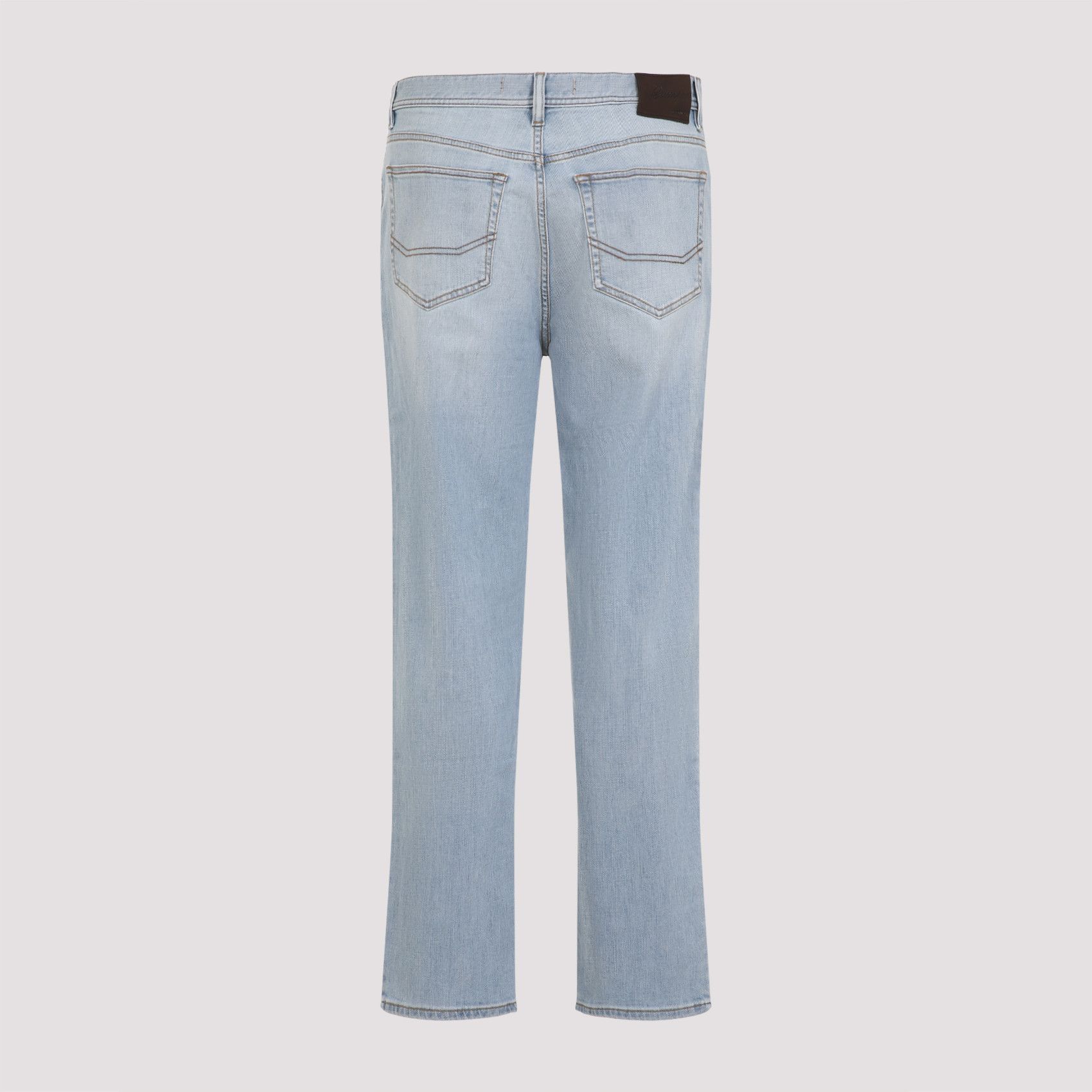 Brioni Merano Light Blue Cotton Jeans. Crafted from bleached light blue stretch cotton denim, mid-waist, belt loops, front button and fly-zip fastening, embroidered logo on the front, 5 pockets design, leather label at the back waistband, straight leg.